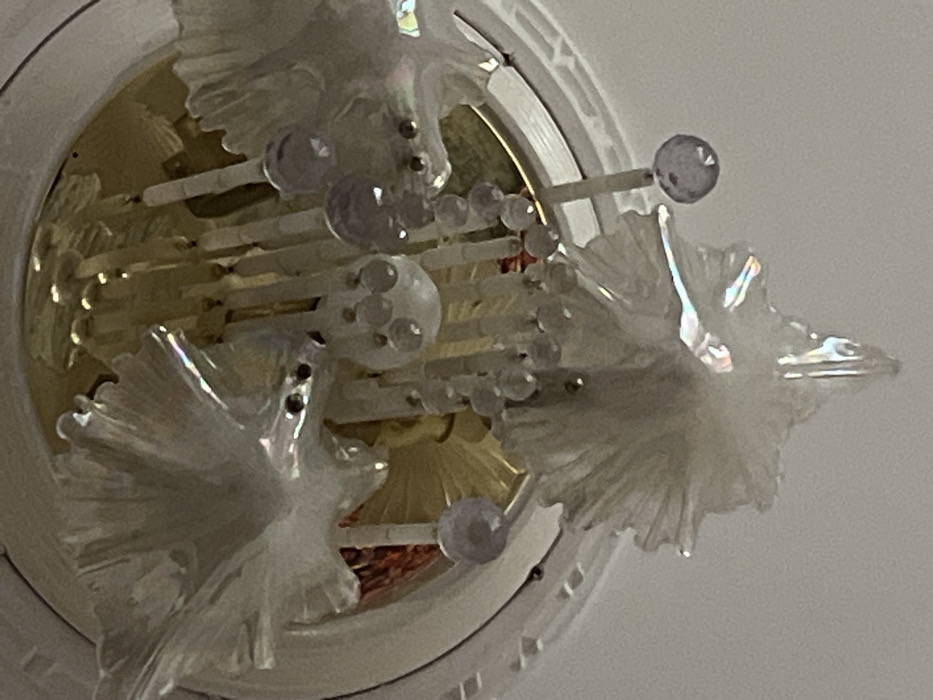 The image displays a detailed, upward-facing view of a decorative chandelier. The central fixture is composed of multiple translucent, iridescent components shaped like birds, specifically doves with spread wings, which are primarily white or off-white with visible rainbow-like refractions. These bird figures are positioned around a central, circular, gold-colored base. Extending upwards from this base are numerous elongated, thin, translucent rod-like elements, possibly simulating candles or light diffusers. Suspended from various points are numerous spherical crystal beads, some appearing clear and others with a faint purple or pink hue. These beads are arranged individually, in small clusters, and in short vertical strands. A white, possibly molded, ceiling rosette or fixture partially encircles the golden base at the periphery of the image. The scene is indoors, showcasing an elaborate lighting fixture. The specific location within the city of Tashkent, Uzbekistan, is not discernible from the visual content of the image.