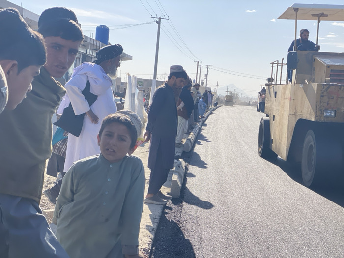 The image captures a road construction scene in Gundigan Village, Afghanistan, under clear daylight