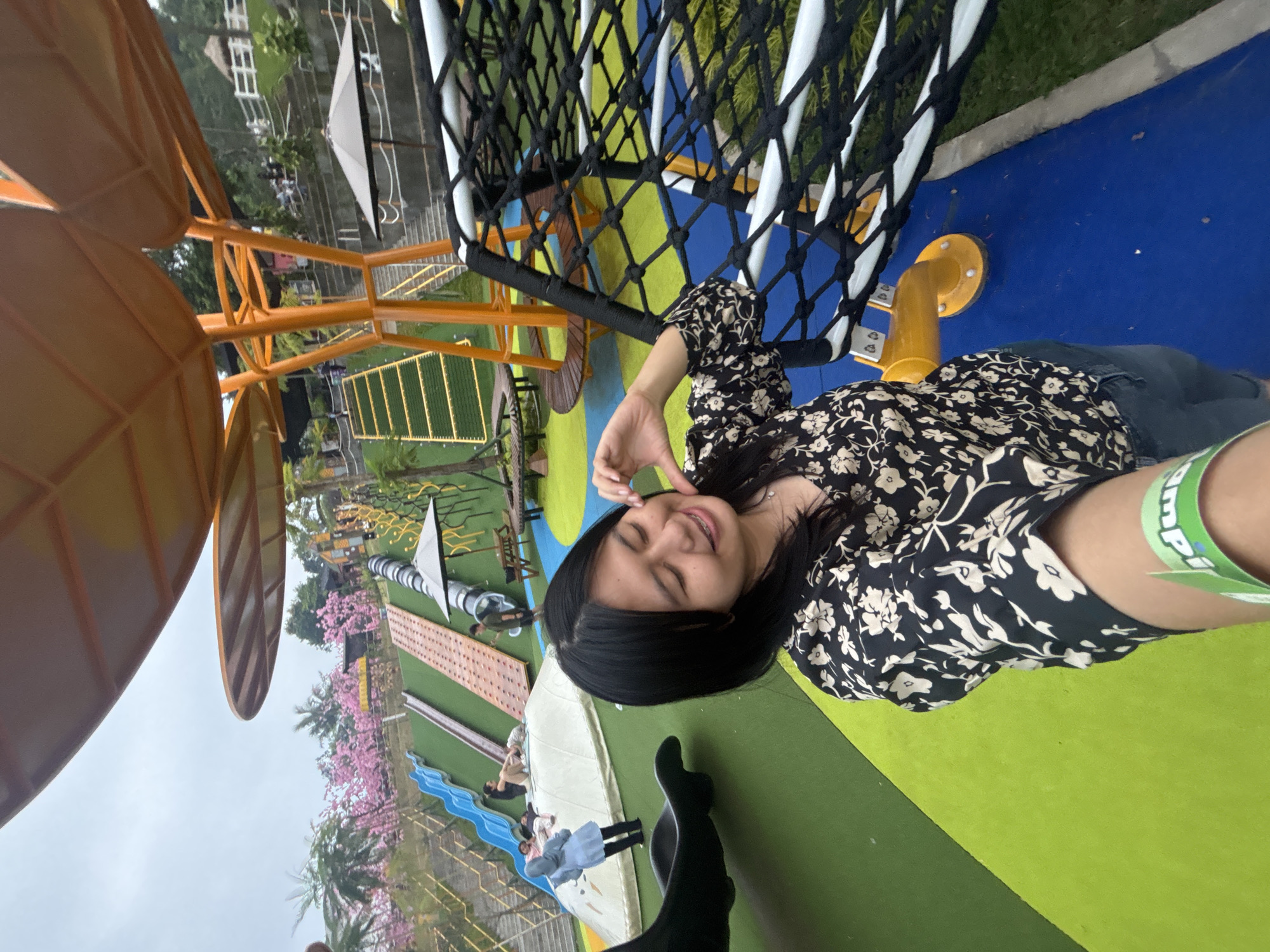A woman is lying in a net hammock at Taman Dayu, a resort city in Prigen, Indonesia. The woman has long black hair and is wearing a floral print top and denim shorts. She is smiling and touching her face with her hand. The background includes a colorful playground with various structures, including a slide, a tunnel, and an orange canopy. Cherry blossom trees are visible in the background, as well as buildings. Several people are in the background.
