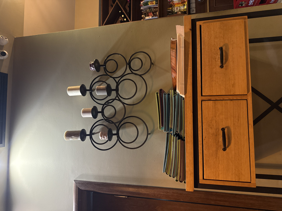 This is an interior, static scene located in Razlog, Bulgaria. The image depicts a light olive green wall under artificial illumination, which highlights a section of the upper wall. Mounted centrally on this wall is a large black metal candelabra, composed of multiple interconnected rings. It holds five candles of varying types: one cream-colored with a wavy texture, two plain cylindrical cream-colored, one shorter light pinkish, and one shorter dark purple/brownish. To the left, a portion of a dark wooden door frame is visible vertically. At the top right, near the ceiling line, a rectangular dark grey ventilation grille and two white dome-shaped security cameras are mounted. Below the candelabra, a wooden console table or sideboard with a dark metal frame occupies the lower half of the image. The table features two rectangular drawers with horizontal black pull handles. On the tabletop, two distinct stacks of multi-colored booklets or menus are present on the left side, exhibiting covers in shades of green, blue, maroon, and brown. To the right of these, a stack of white rectangular papers is topped by a light-colored, oval-shaped wooden or ceramic tray. In the background on the far right, a shelving unit, likely a wine rack, is partially visible, stocked with numerous bottles, including what appear to be wine and various liquor bottles such as Absolut Vodka and Captain Morgan. Below this unit, a red Coca-Cola crate is partially visible. No individuals are present in the scene.
