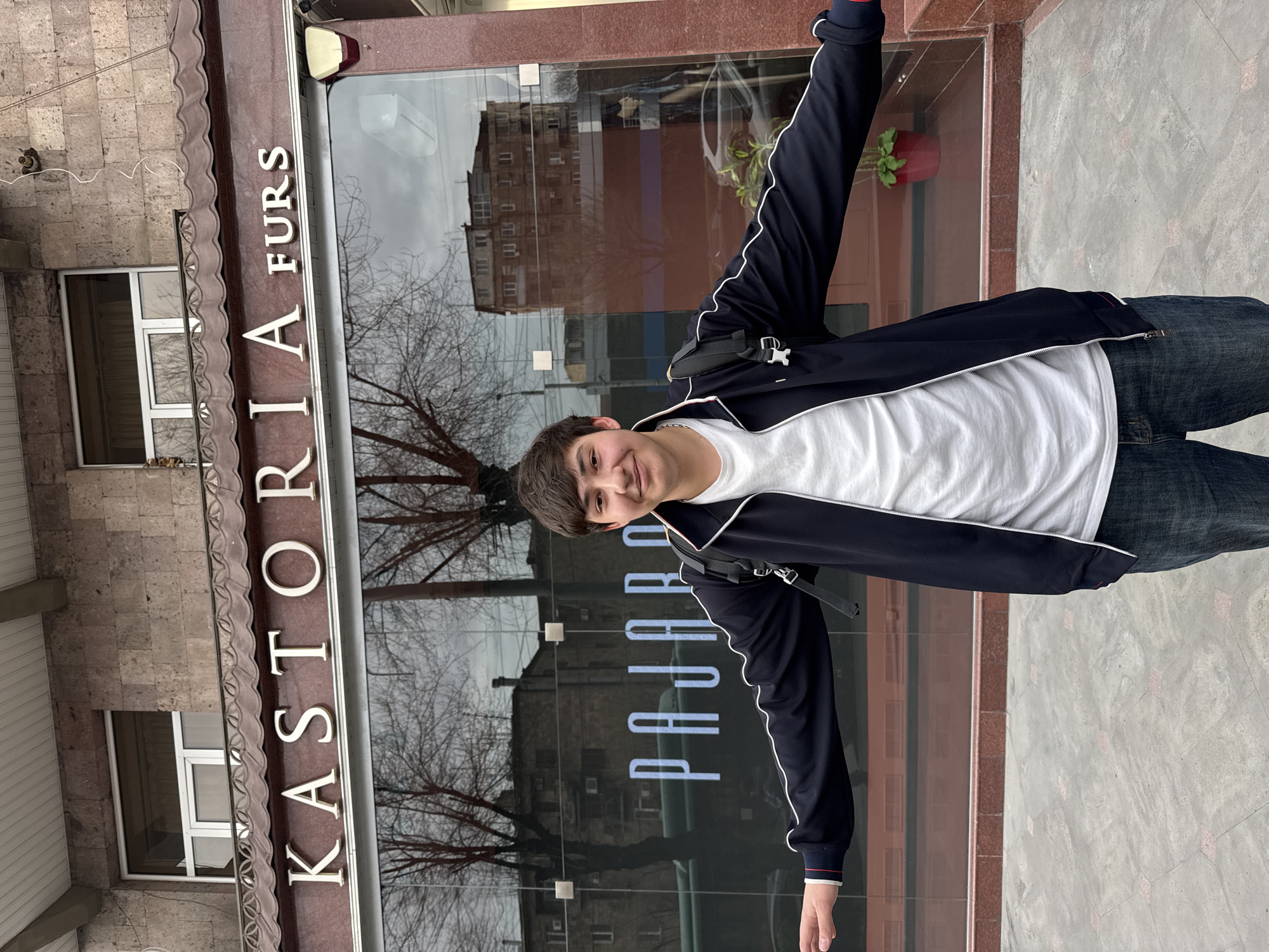 A young male is standing in front of a building that reads "KASTORIA FURS" on the awning in the city of Yerevan, Armenia. The man has dark hair, wearing a white t-shirt, a navy blue jacket with white trim, and blue jeans. He is partially turned to the left, smiling at the camera with both arms raised. He is wearing a black backpack. The building has glass panels reflecting the surrounding buildings. The ground is paved with grey tiles.