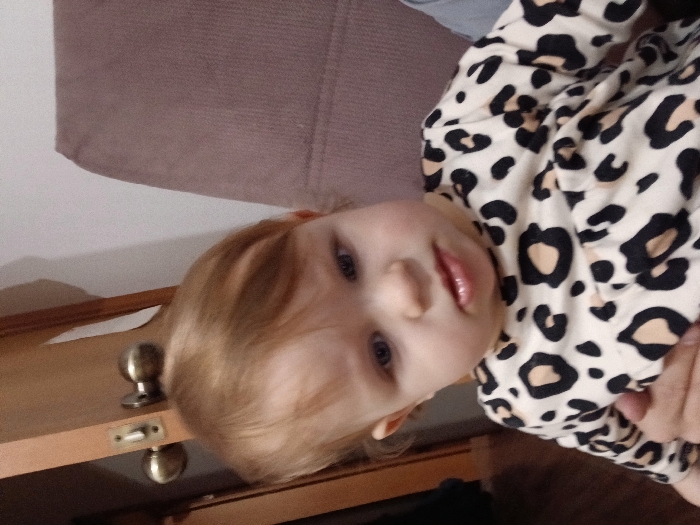 A baby with blonde hair and blue eyes looks directly at the camera, positioned against a tan cushion or headboard. The baby wears a cream-colored shirt with a brown and black leopard print. A wooden dresser or cabinet with brass knobs and a partially visible piece of white paper sits in the background. The photo is slightly rotated counter-clockwise.