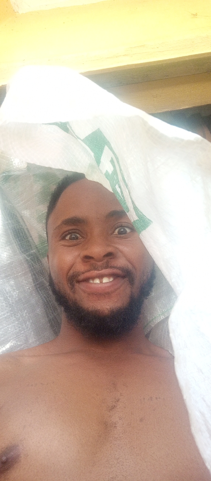 The image depicts a close-up, chest-level portrait of an adult male in what appears to be an indoor or semi-sheltered environment within the city of Tunga Mekidi, Nigeria
