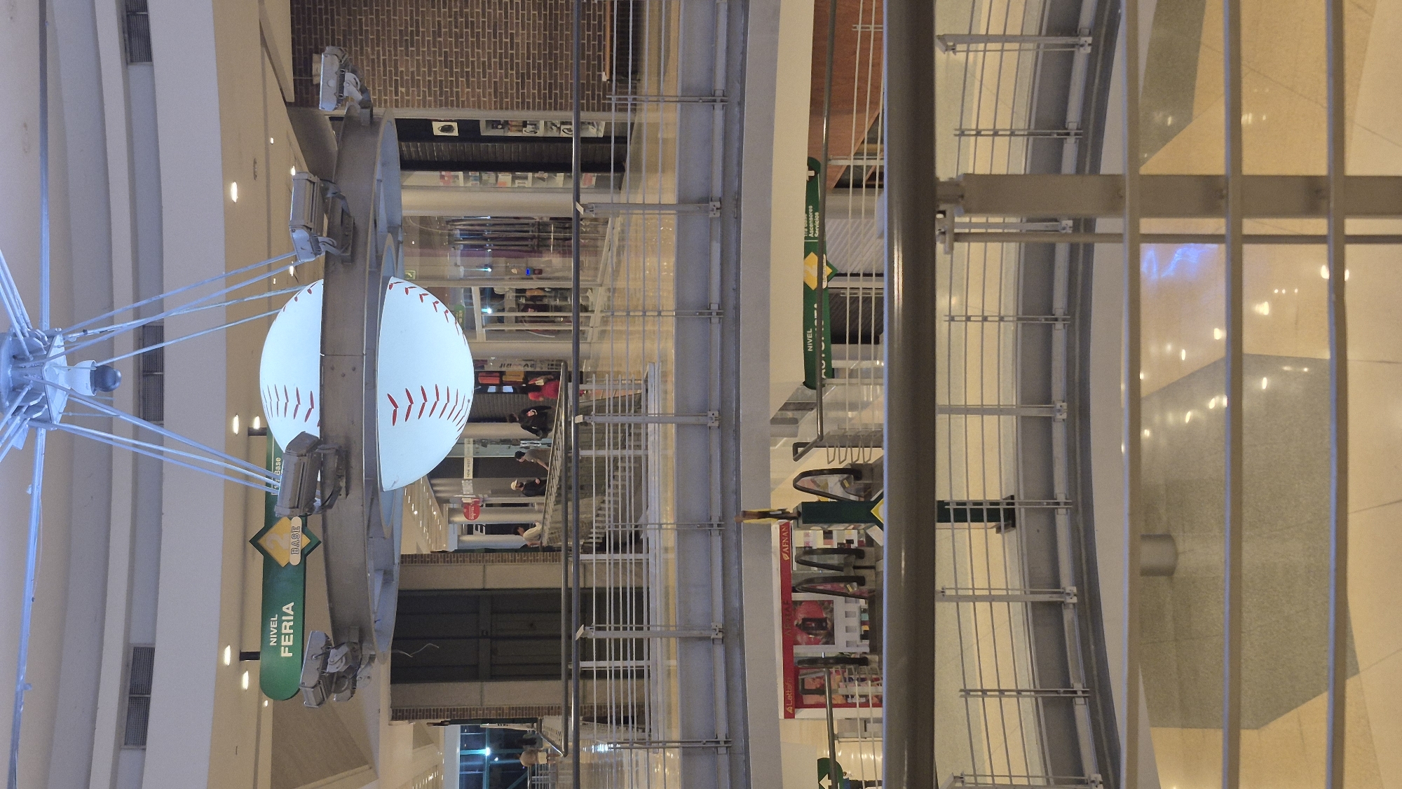 The image depicts the interior of a commercial building, likely a shopping mall, in Valencia, Venezuela. A large, spherical baseball decoration hangs suspended from the ceiling in the foreground. Several people are visible on an upper level through a metal railing. The baseball decoration is labeled "Nivel Feria" and "Base". The environment is well-lit, and the architectural details suggest a contemporary commercial space.