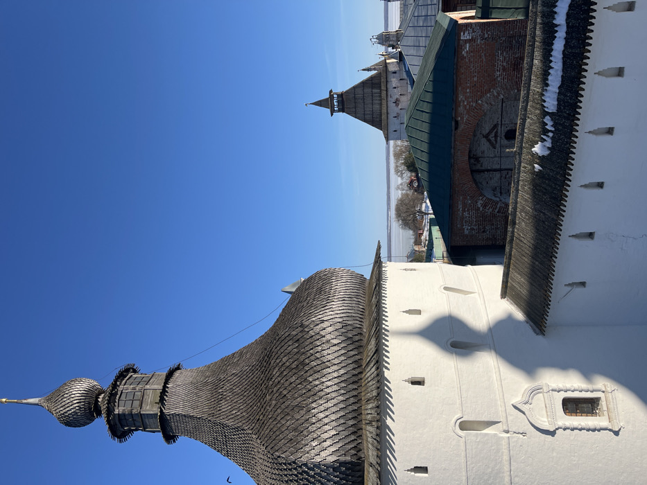 The image displays an exterior architectural scene in Ketoshi, Russia, under a clear, bright blue sky. In the immediate foreground, a substantial white cylindrical tower with a dark, textured, wooden-shingled onion dome roof, topped by a slender golden finial, occupies the left side. The tower's white facade features multiple small, rectangular embrasures and a single ornate, rectangular window near its base. A distinct, elongated shadow of an adjacent architectural element, resembling another onion dome, is cast across the tower's white surface. In the midground, other structures are visible, including a second white tower with a dark, conical wooden roof, situated further right. Below this, brick buildings with dark green, pitched roofs are present, some showing minor patches of snow. A low, white crenellated wall runs across the lower portion of the frame, also with small snow deposits. The background reveals a wide, frozen body of water, likely a lake, extending towards the horizon. A sparse line of bare trees borders the distant shore of the lake. A thin, dark cable or wire is visible extending vertically along the left side of the foreground tower. A small, dark bird is captured mid-flight in the upper left quadrant of the image. The scene is brightly illuminated, indicating direct sunlight and a winter environment. No people are present.