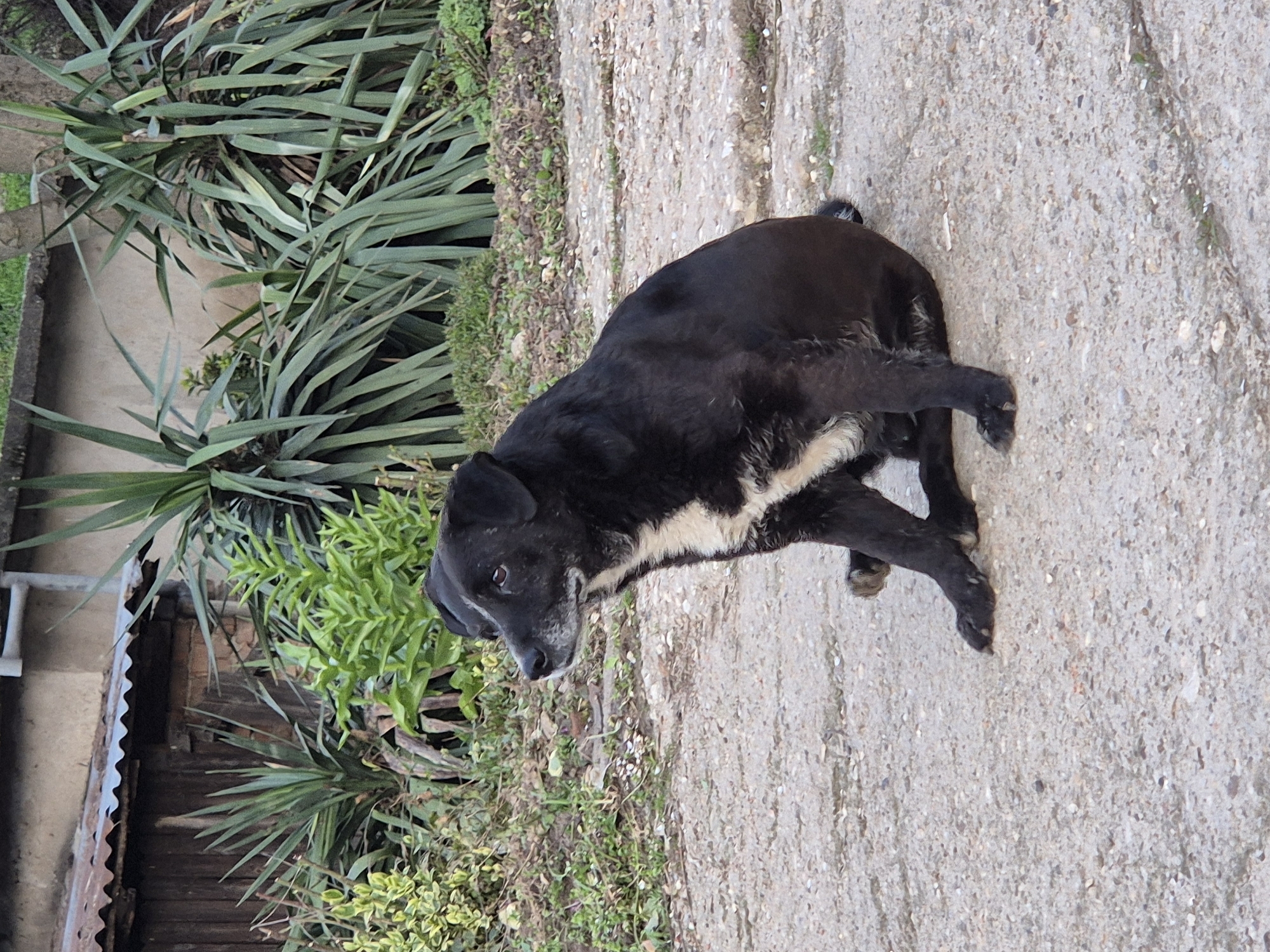 black dog with white markings on its chest resting on a concrete surface. The dog is positioned diagonally in the frame, with its head turned towards the left side of the image. To the left of the dog are various green plants and part of a building with a corrugated metal roof. The location is Tutrakan, Bulgaria.