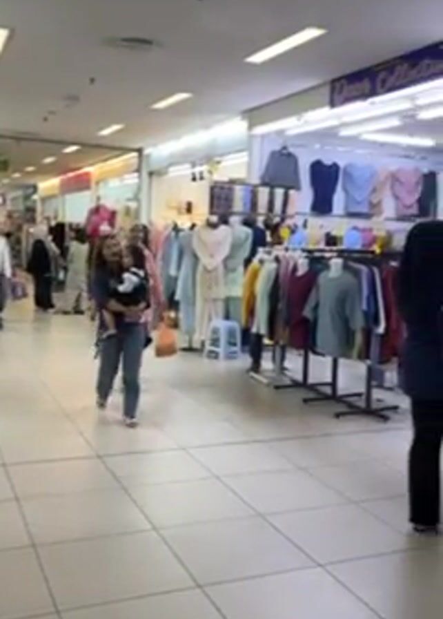 interior of a shopping center. The shopping center has shops on both sides of a corridor. The shops contain clothing, displayed on mannequins and racks. People walk along the corridor and browse through the clothing. The corridor is brightly lit by overhead fluorescent lights. The floor is covered in square white tiles.