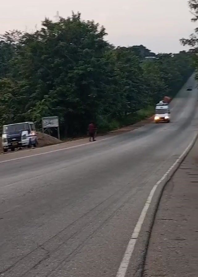 gray asphalt road with a white dividing line cutting through the middle. The road is lined with trees on both sides, giving the impression of a rural or semi-rural setting. A white van loaded with items on its roof approaches the camera. In the background, another vehicle can be seen further down the road. A person walks on the left side of the road, heading in the same direction as the van. A sign and a parked vehicle are visible on the side of the road, near a small patch of dirt. The sky appears overcast.