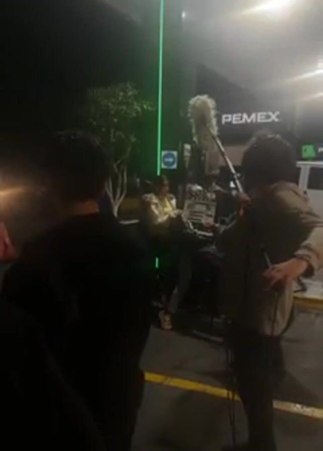 film set in front of a Pemex gas station at night. A person in a yellow shirt sits on a motorcycle as a boom operator stands on a box holding a microphone. A crew member stands to the left of the operator. The slate is seen with the call “5.1.1.” The operator calls “Camera” and “rolling,” and the slate clacks to mark the take.