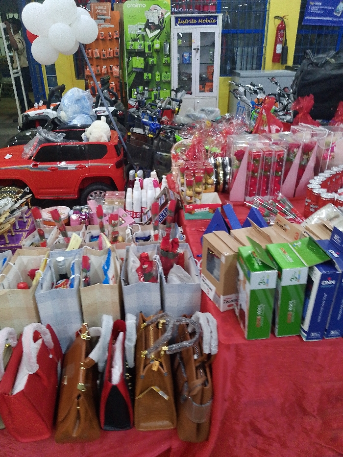 table laden with gifts and merchandise. There are several purses, gift bags with items like roses and snacks, and various packaged goods. In the background, there's a small red toy car, bunches of white balloons, and other items such as bicycles and shelving units with products. A fire extinguisher is visible on the wall, suggesting a retail or store environment.