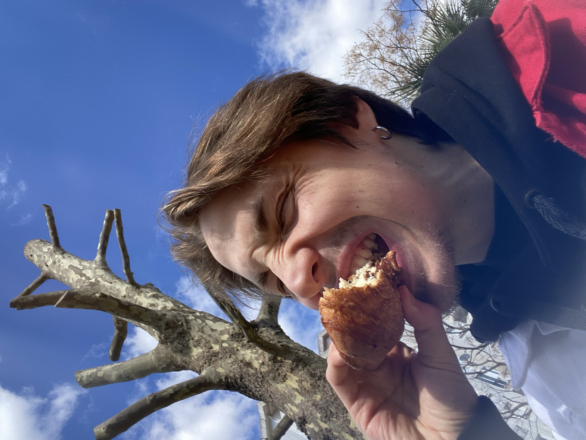 A person is biting into a pastry. The person has brown hair, light skin, and is wearing a black hoodie with a red patch on the shoulder. The person has a small silver hoop earring in their left ear. The pastry is a light brown color with a flaky texture. The person's eyes are squinted shut. Behind the person is a blue sky with white clouds. A bare tree branch is also visible on the left side of the frame. The location cannot be determined from the image.