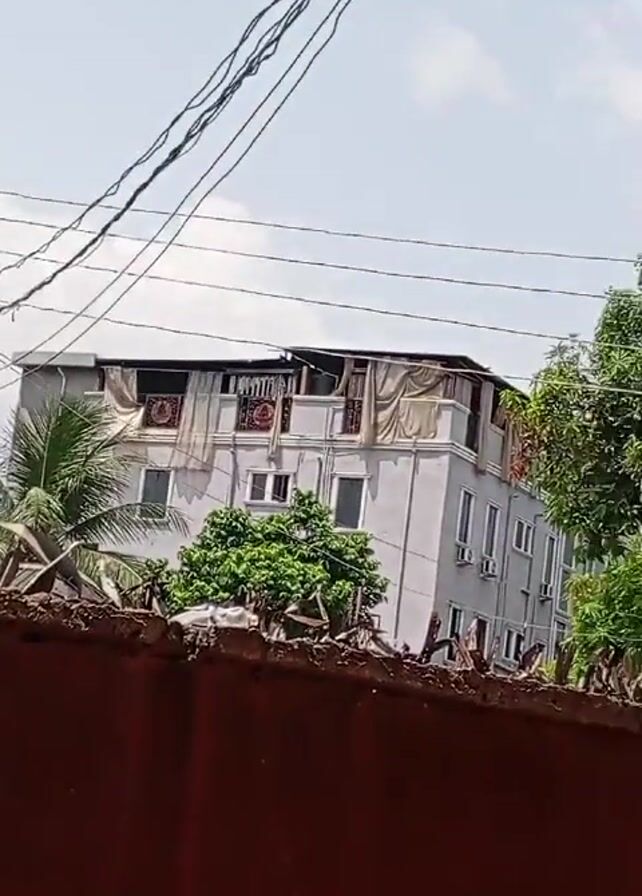 building through the gap in a brown, sharp-edged fence. The building is light gray and appears to be several stories tall, with multiple windows and air conditioning units. There are patches of draped fabric hanging from the top of the building, perhaps used for shade or privacy. A few trees with green foliage are visible, partially obscuring the lower portion of the building. Above the building, power lines crisscross against a cloudy sky. The camera is relatively static, providing a fixed perspective of the scene.