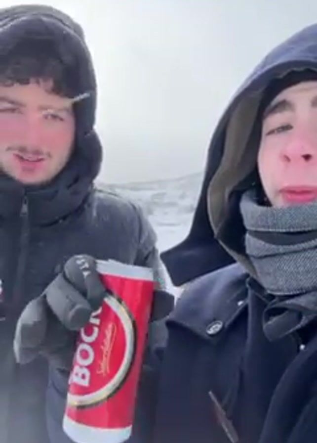 Two young men, bundled in winter clothing, stand in a snowy landscape, holding cans of Bohs beer. The man on the right wears a hooded navy coat and a gray scarf. The man on the left is in a dark hooded jacket and black gloves. The background is a white, snow-covered terrain. The sky is overcast.