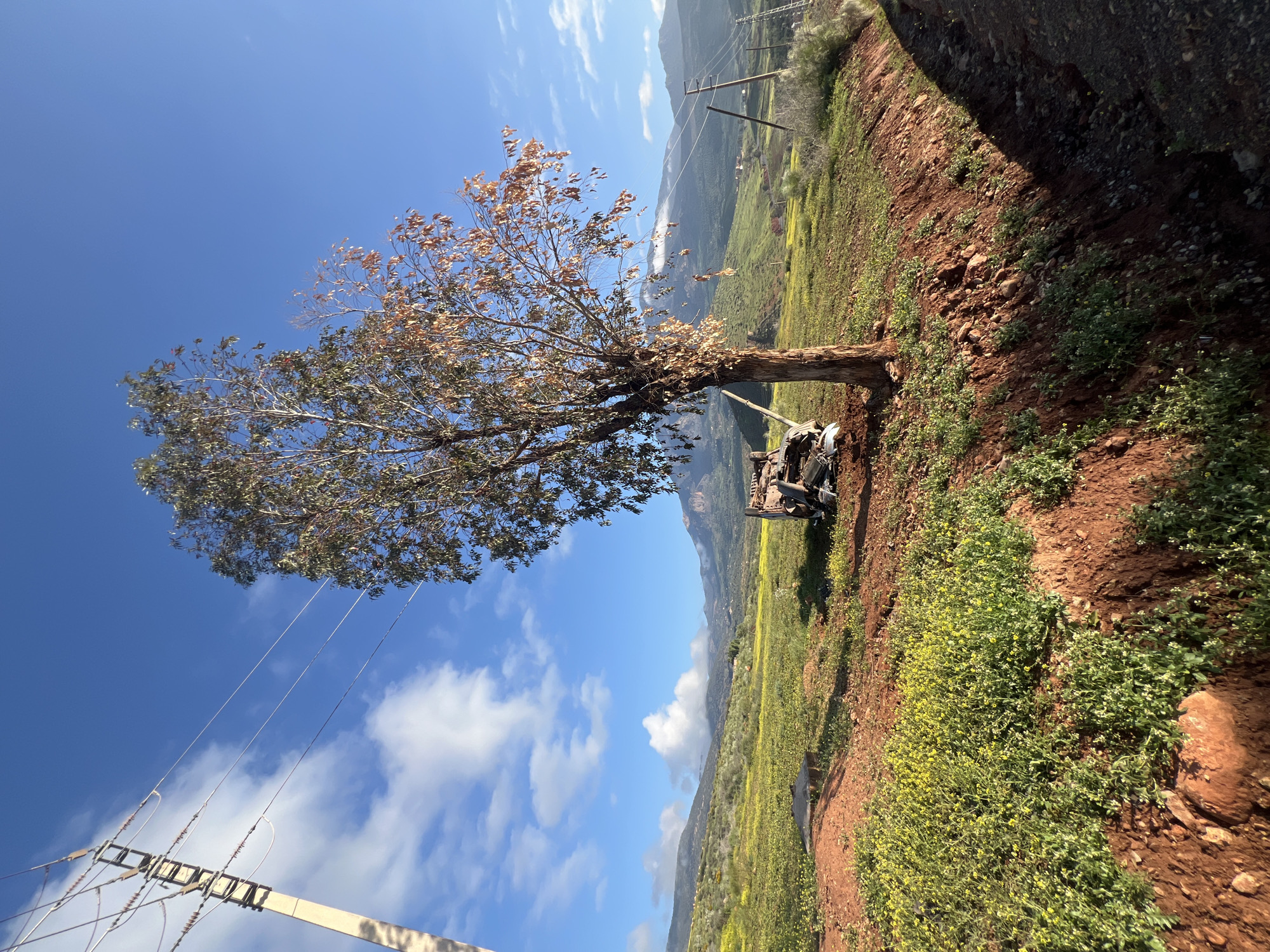 The scene is a rural landscape near Ouaouizert, Morocco, observed under a clear blue sky with scattered white cumulus clouds. The foreground features exposed red-brown soil, patches of green vegetation, and numerous small yellow wildflowers. A prominent, tall tree, exhibiting both healthy green foliage and clusters of dry, brown leaves, stands centrally. At the base of this tree, a severely damaged and inverted vehicle chassis or cab, consisting of crumpled metallic components, is present. To the far left, a concrete utility pole supporting multiple insulators and power lines extends vertically upwards. The mid-ground is dominated by expansive green fields densely covered with yellow wildflowers. In the background, undulating green hills transition into distant, higher mountains, with some peaks partially obscured by clouds or mist. Additional utility poles and power lines are visible receding into the distant right background. No individuals are present in the depicted scene.