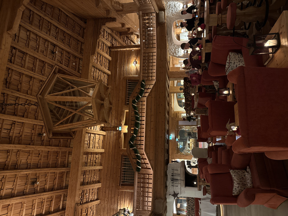 A cozy, rustic interior features warm lighting and wooden architecture. Ornate wooden ceilings and a large, cage-like chandelier dominate the upper space. Below, plush red armchairs are arranged in rows, facing towards a fireplace and a snow-decorated area. People are seated at tables in the background, creating a lively atmosphere. A staircase with garland runs along the side.