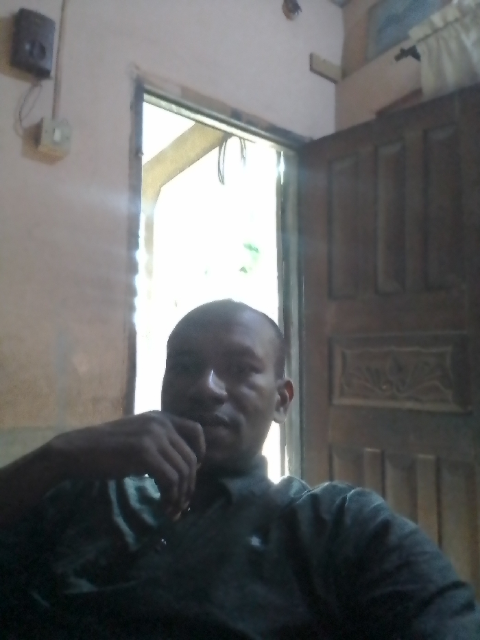 A man sits indoors, with a hand near his face, in front of a partly open door with bright outdoor light streaming through. Behind him is a carved wooden door. On the wall to his left are electrical boxes. The wall appears to be faded paint. He is wearing a dark buttoned shirt. His expression is thoughtful. The image is somewhat dark and grainy.