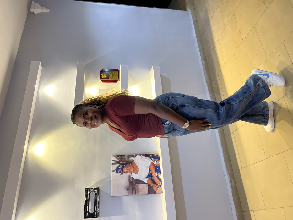 An adult female is depicted standing in an interior space in the city of Rafin Bauna, Nigeria. She is positioned slightly angled to her right, with her left foot slightly raised, smiling directly at the camera. The woman wears a short-sleeved, reddish-brown V-neck top, loose-fitting blue jeans, and white sneakers featuring light blue Nike swooshes. She has gold-colored hoop earrings and a gold-colored wristwatch on her left wrist. Her hair is braided with light brown highlights. The background consists of a light grey wall with four upward-pointing recessed spotlights. Three white floating shelves are mounted on the wall; the top and bottom shelves appear empty. On the middle shelf, a framed canvas portrait of an older woman in traditional attire is placed on the left, next to a reddish-brown plaque with gold-colored details on the right. A black, wall-mounted bracket is visible on the wall above the left side of the middle shelf. The floor is tiled with light beige rectangular tiles arranged in a staggered pattern.
