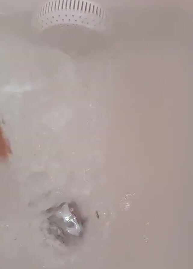 A close-up, top-down shot shows a hand moving through water in a bathtub