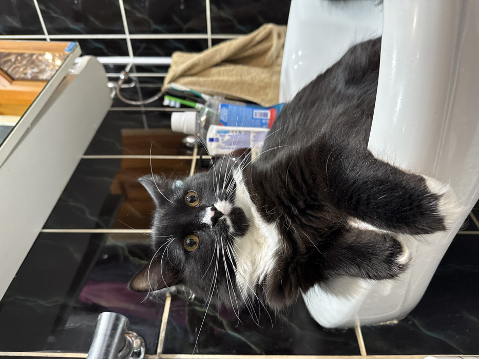 This image depicts a domestic bathroom in Lida, Belarus. The primary subject is a medium-sized bicolored cat, exhibiting a tuxedo pattern with predominantly black fur and significant white markings on its chest, muzzle, and paws. The cat is positioned inside a white rectangular porcelain sink, with its front paws resting over the front rim. Its eyes are amber, and it has prominent long white whiskers emanating from its muzzle, which features a distinct white blaze on its nose. A faint blue marking is visible on the inner aspect of its left ear (viewer's right). The cat's gaze is directed slightly upwards and to the right, indicating alertness. The bathroom environment features walls covered with dark, reflective tiles, possibly black or dark gray, with white grout lines. Above the sink, a white shelf unit with an integrated mirror is partially visible. To the left, a chrome faucet is partially cropped out of view. To the right of the cat, behind the sink, various toiletries are arranged: a transparent bottle of mouthwash with a white cap and a blue label, and several toothbrushes (at least two green and one blue). A beige or light brown terry cloth towel hangs from a circular chrome towel ring. Further back on the shelf, a small ornate wooden object is visible. The scene is illuminated by internal lighting, casting reflections on the tiled surfaces and the cat's eyes.