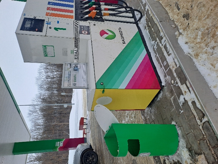 A gas pump displays various fuel nozzles, a digital screen, and signage. The pump is adorned with green, turquoise, pink, and yellow stripes. A green trash receptacle with a white lid is positioned next to the pump. The ground is brick, dusted with snow, and a road is visible in the background. The Bashneft logo is on the pump.