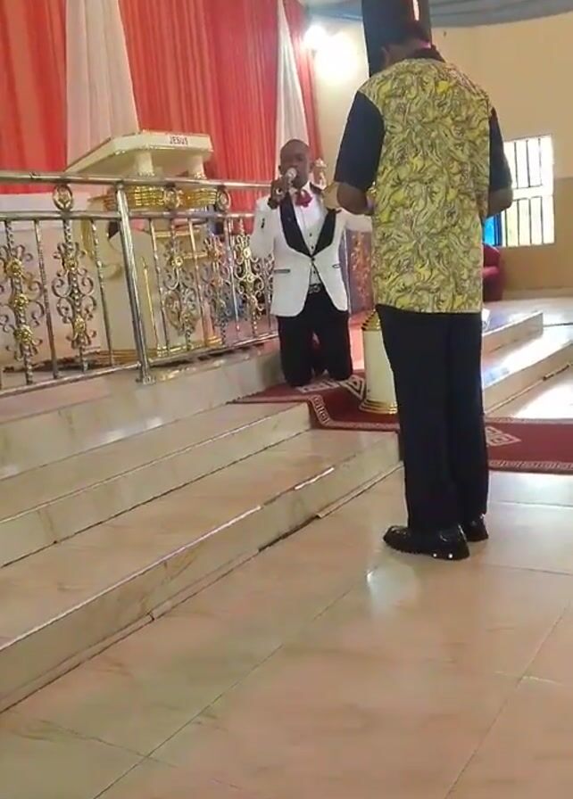 An individual in a white tuxedo with a red bowtie is kneeling on a red rug in a church sanctuary, singing into a microphone held in their hand. The person is facing a lectern with the word "Jesus" on it, protected by a metal railing. Behind them, a person in a black shirt with a patterned yellow design, black pants, and a black hat stands silently, possibly overseeing the singing. The sanctuary is decorated with red and white curtains, and light streams in from a window on the right. The floor is tiled with a brown and white pattern.