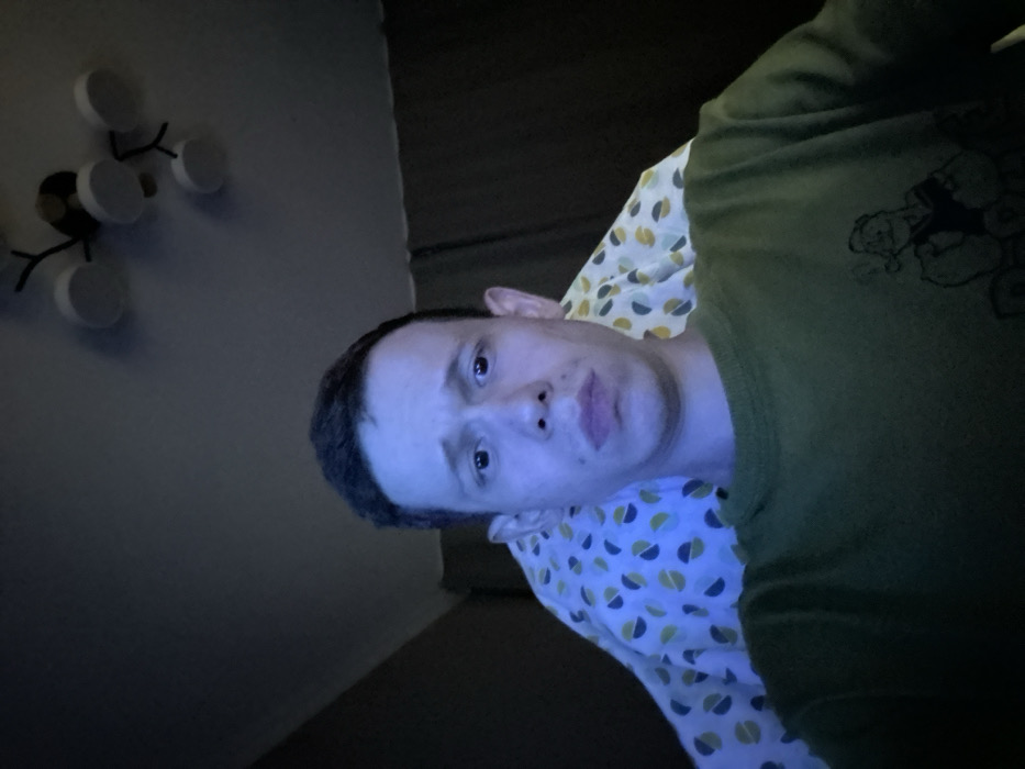 A person lies on a pillow with a half-circle pattern, wearing a dark green shirt with a design on the sleeve. The image has a blue tint and low lighting. Part of a decorative wall fixture is visible on the left side, featuring several white, round lights attached to black branches. The background is dark and mostly out of focus. The image is rotated.