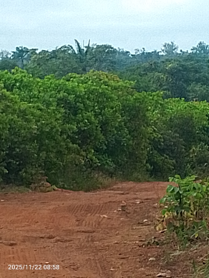 A dirt road, reddish-brown, stretches between dense green vegetation under an overcast sky. Tire tracks mark the road's surface. Lush greenery lines both sides, creating a natural tunnel effect. Distant trees fill the horizon, adding depth to the scene. The overall impression is of a secluded path through a forest or jungle environment, captured on 2025/11/22 at 08:58.