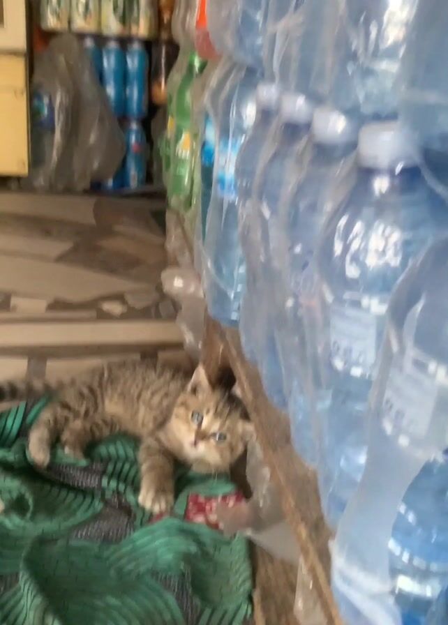 kitten lying on a patterned cloth. The kitten has tan and brown stripes and bright blue eyes. It is lying in front of a stack of water bottles in a shop or store, based on the shelves filled with various goods in the background. The floor has a geometric tile pattern. A squeaking noise can be heard in the audio.