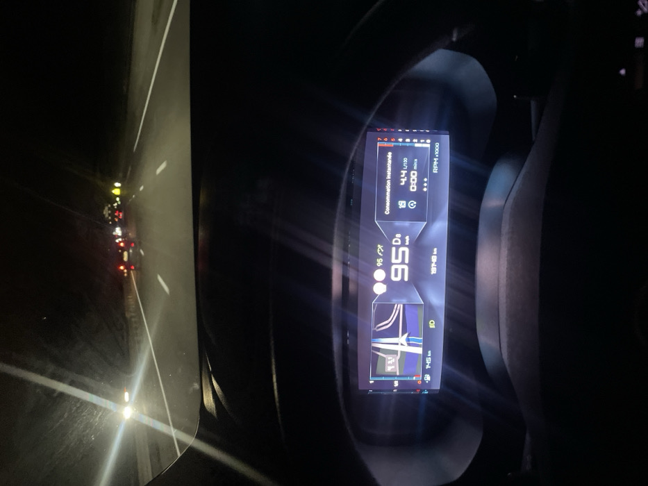 The image presents a nighttime view from the driver's perspective inside a vehicle on a multi-lane highway in Illkirch-Graffenstaden, France. The road ahead is dark, illuminated primarily by vehicle lights. White lane markings are visible on the asphalt. Multiple vehicles are observed ahead, indicated by their red rear lights and a bright white light from an approaching or distant vehicle on the left. Further down the highway, several yellow or orange lights are present, suggesting additional vehicles or road features. The vehicle's windshield displays some reflections and minor streaks. The foreground is dominated by the vehicle's digital instrument cluster and a portion of the dark-colored dashboard. The instrument cluster centrally displays the current speed as 95 km/h, with "D" and "km/h" below it. To the left, a navigation graphic shows a blue road segment with white lines and a directional indicator. Below this, "745 km" is visible, likely indicating remaining distance. The odometer displays "19748 km". On the right side of the cluster, "Consommation instantanée" (Instantaneous Consumption) is shown as "4.4 L/100" (liters per 100 kilometers), with "0:00" mins below it. A vertical RPM gauge on the far right indicates low engine revolutions. The top rim of the steering wheel is partially visible at the bottom of the frame.