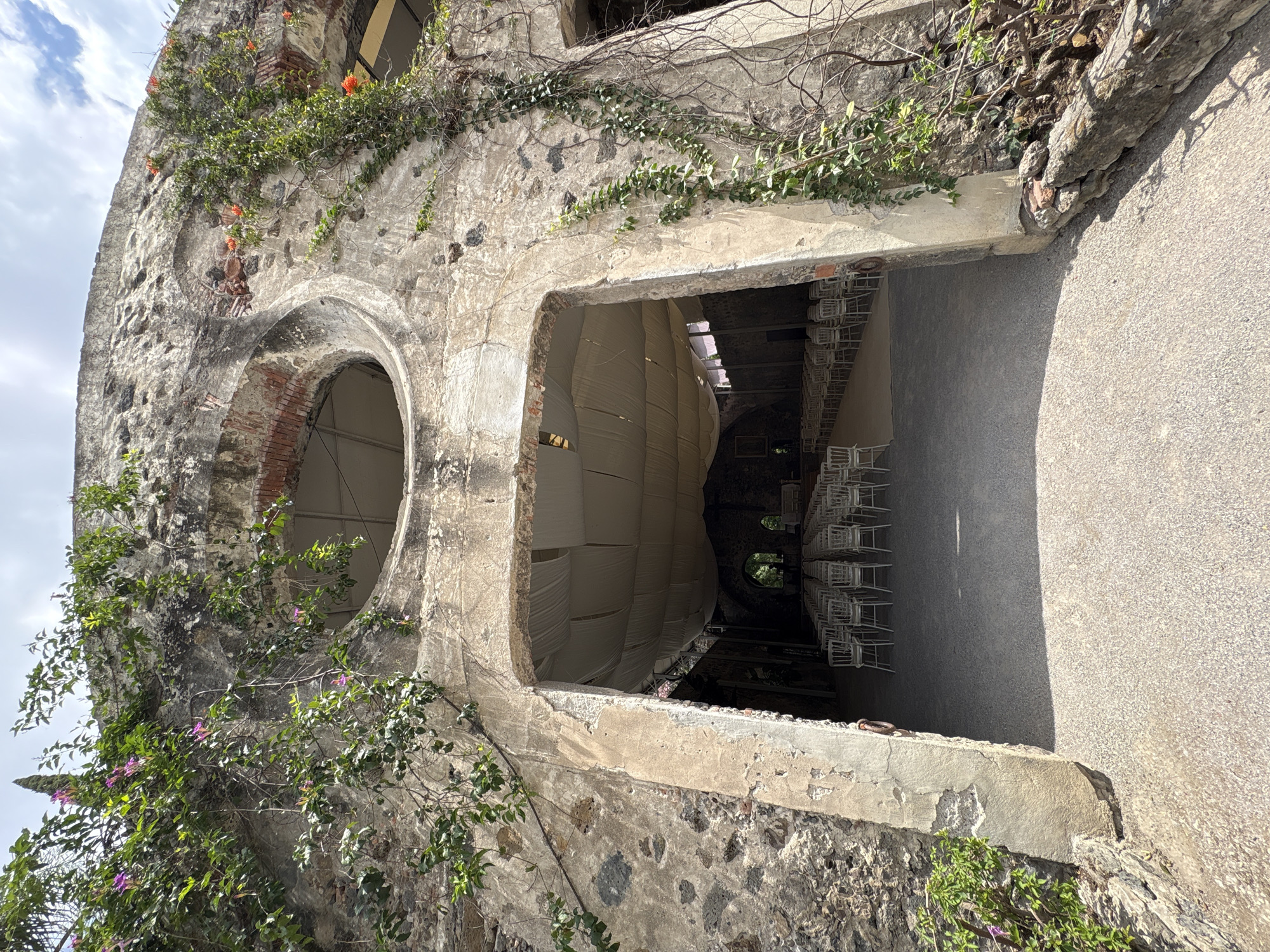 Exterior view of the dilapidated structure of the Hacienda de Cortes in Jiutepec, Mexico. The stone building has a round opening with exposed brick around the edges and another rectangular opening with fabric hanging inside. Numerous rows of white folding chairs are inside the structure. Vines and plants with orange and purple flowers grow on the walls. A concrete pathway is to the right. The image is rotated.
