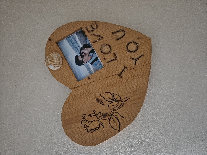 A medium-sized heart-shaped wooden plaque is affixed to a textured, light-colored wall. The plaque exhibits visible wood grain. On its left side, a pyrographically etched outline of a rose with leaves is present. The words "I LOVE YOU" are vertically etched on the right side. A rectangular photograph is embedded in the upper right portion of the plaque, showing a male wearing sunglasses being kissed on the cheek by a female. A beach and ocean are visible in the background of the photograph. A small, ribbed seashell is attached to the plaque directly above the photograph. The immediate background is an undecorated wall. No visual information within the image identifies a specific location within the Cherwell District, United Kingdom.