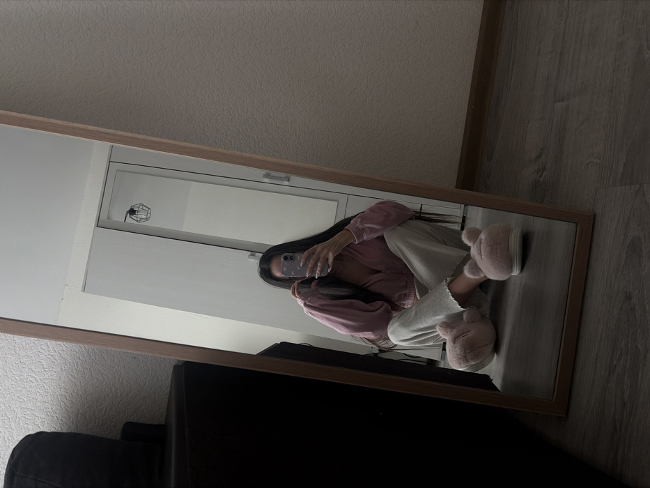 The image depicts an indoor scene within a room in Novosaratovka, Russia. A single individual, seen in reflection, is seated on a light wood laminate floor, facing and interacting with a full-length mirror with a light brown wooden frame. The person is wearing a pink long-sleeved top, light-colored wide-leg pants, and pink, fluffy animal-themed slippers with ear-like features. The subject's long, dark hair is visible, and their face is obscured by a smartphone, which they are holding with both hands to capture the mirror selfie. The phone has a light-colored case, and long, light-colored fingernails are visible. To the left of the mirror, a dark piece of furniture is partially visible. In the reflection, behind the individual, light-colored wardrobe doors with silver handles are present, along with a black, geometric light fixture suspended from the ceiling. The wall to the right of the mirror has a light, textured surface.