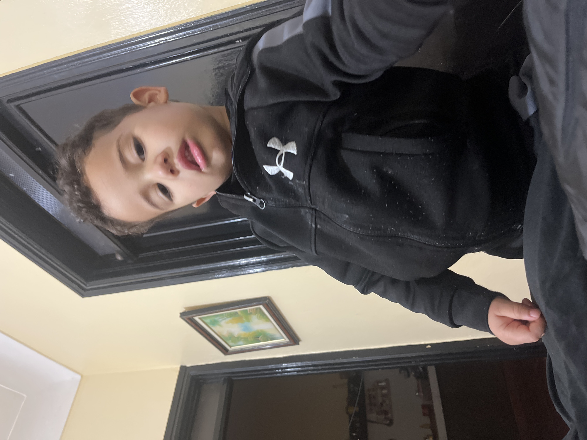 The scene is an interior domestic setting in Ouaouizert, Morocco. A young child with light skin and curly brown hair is positioned centrally, looking directly towards the camera. The child's mouth is slightly open, revealing the lower lip. The child wears a black full-zip hoodie with a white Under Armour logo on the chest and grey stripes on the sleeves. Small white fibrous particles are visible on the surface of the hoodie. Black pants are partially visible in the lower foreground. The child's right hand is partially fisted and rests on a dark fabric surface. The background features pale yellow walls and a white ceiling. To the right of the child, a dark, likely black, door frame is partially visible. To the left, another dark-framed doorway leads into a darker adjacent room, where a counter or shelf with various small objects is discernable. Between the two doorways, a framed picture with a brown frame hangs on the yellow wall, depicting a landscape with green foliage and a light blue/yellow central element.