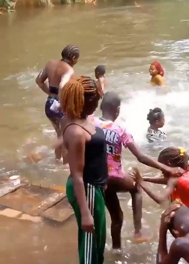 group of around a dozen people of varying ages enjoying themselves in a shallow river or stream. The water appears slightly murky. The setting seems to be a natural environment with trees and foliage visible on the riverbank. Several individuals are fully immersed in the water, swimming or wading, while others stand or sit at the edge of the water, interacting with those in the water. One person, wearing a black top and green striped pants, stands near the edge of the water while others splash around them. Overall, the scene depicts a group of people engaged in recreational water activities in a natural outdoor environment.