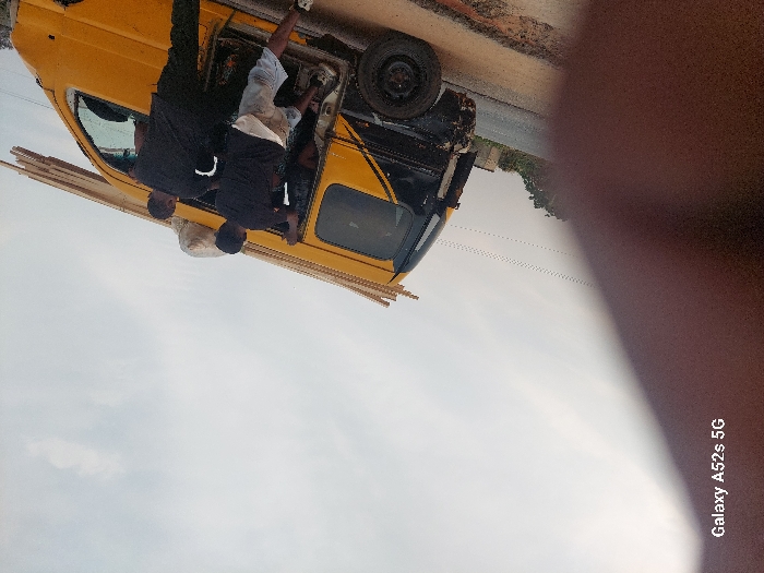 A yellow vehicle is parked next to a road with three individuals near the open driver-side door. One man is dressed in light shorts and a white shirt, while the other two are wearing dark shirts. The vehicle appears to be loaded with long, thin pieces of lumber or similar material extending out over the hood. Overhead power lines are visible in the background. The sky is overcast with no visible sun.