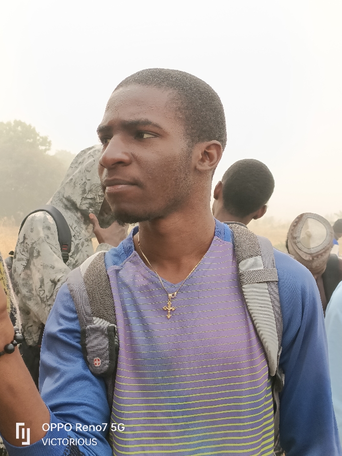 The image depicts an outdoor scene in Dutse, Nigeria. The primary subject is a young adult Black male positioned in the foreground, oriented slightly left of center, with his head turned to look towards the left. He has short dark hair and a thin beard. He is wearing a short-sleeved, blue V-neck shirt featuring horizontal stripes of purple and yellow across the chest and abdomen. A gold-colored chain with a detailed crucifix pendant hangs around his neck. A grey and black backpack is worn over his right shoulder, with a red and white circular logo visible on the front strap. A dark, beaded bracelet is on his left wrist. In the mid-ground to the left of the main subject, another individual is partially visible, wearing a grey camouflage-patterned hooded jacket and a black backpack. To the right of the primary subject, a third individual is seen from behind, wearing a dark garment and a light-colored, possibly beige or white, round cap. The environment consists of dry, light-colored vegetation, likely tall grasses or shrubs, in the mid-ground. The background is characterized by a bright, uniform haze that obscures distant details, with faint dark shapes suggestive of trees visible on the far left horizon. The overall lighting is bright and diffuse. A watermark stating "OPPO Reno7 5G VICTORIOUS" is visible in the lower left corner of the image.