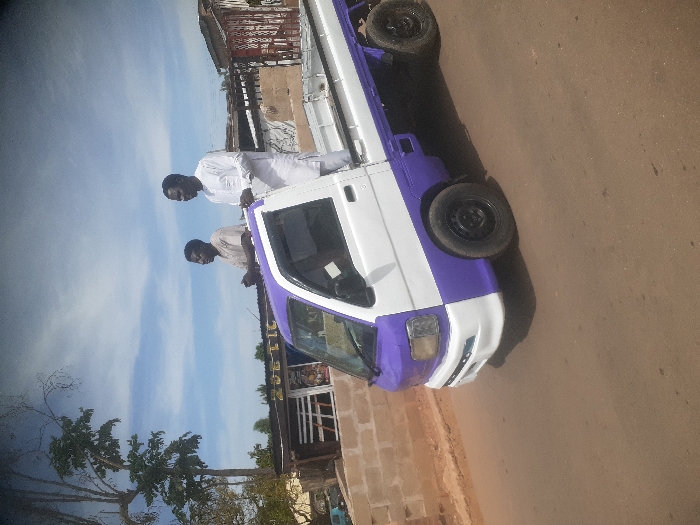 An undated daylight image depicts two adult males standing in the white flatbed of a two-tone (purple and white) compact utility truck, possibly a Daihatsu Hijet or similar Kei truck, traveling on a reddish-brown paved road in Gura Top, Nigeria