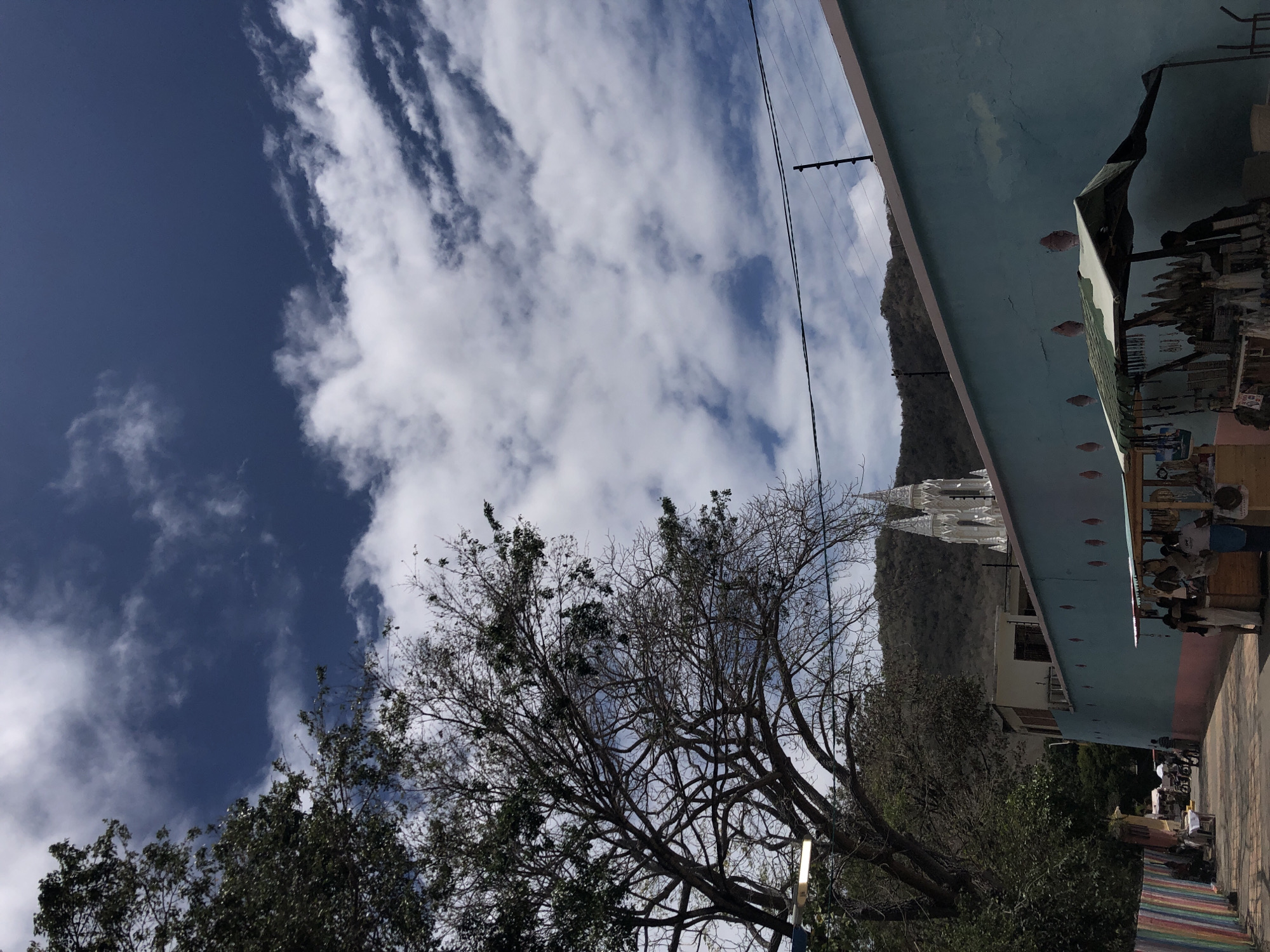 The image captures a scene in El Valle del Espíritu Santo, Venezuela. Predominantly visible is a partly cloudy sky, transitioning from a deep blue to areas filled with white clouds. In the foreground, there are tree branches with sparse foliage. Behind these, there appears to be a building with light-colored walls, possibly a church or other significant structure, situated against a backdrop of a hillside. To the right side of the frame, a portion of a building with a blue and pink facade is noticeable, and there seem to be people nearby. The ground appears to be paved, suggesting an urban or semi-urban environment.