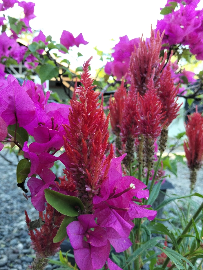 Crimson celosia flower spikes stand amidst vibrant magenta bougainvillea blossoms