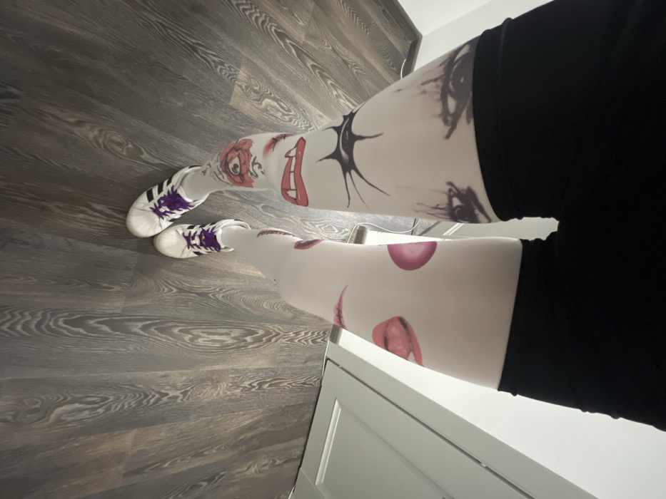 The image depicts the lower body of an individual standing indoors in Krasnoyarsk, Russia. The person is wearing black shorts or underwear over white tights or leggings adorned with distinct graphic prints. The left leg features a design including dark stylized eyes with streaks, a spiky black motif, red lips with fangs, and a red eye within a floral pattern. The right leg displays multiple pink/red circular shapes and various depictions of lips. The individual is wearing white Adidas Superstar sneakers with black stripes and purple shoelaces, exhibiting signs of wear. The flooring is dark grey/brown laminate with a wood grain pattern. A white wall or door is visible in the background to the right and left, indicating an interior setting. No other individuals or active interactions are observed.