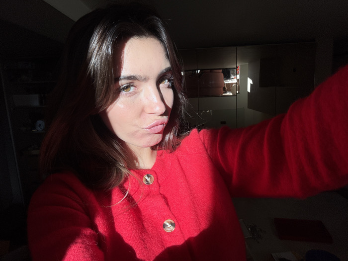 The scene depicts a female subject in a close-up selfie, taken indoors within a residential setting in Porto, Portugal. The subject, with medium-length dark brown hair and light brown irises, has fair skin dramatically illuminated by a strong, directional light source, presumably sunlight, from the right, creating a distinct shadow line across her face. She wears a bright red, textured cardigan with visible gold-toned buttons. Her lips are pursed in a "duck face" expression, and her gaze is directed towards the camera. Her right arm, covered by the cardigan, extends forward, indicating she is holding the camera. The background is largely obscured by shadow. On the left, a dark shelving unit contains vague, indistinct objects. On the right, a darker cabinet or wall unit reflects some light, revealing a large, reddish-brown cylindrical object, such as a barrel, and a small, bright rectangular light source in the deeper recesses of the room.