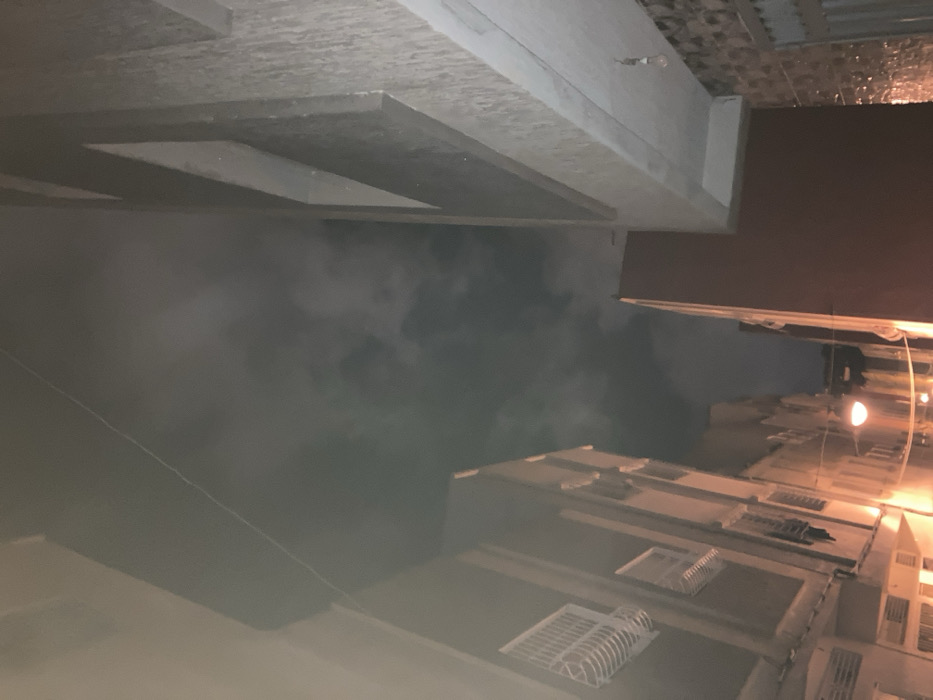 Buildings line a narrow street at night. One building overhead has a unique multi-level design with recesses. Above, dark clouds fill the sky. The street's warm-toned lights illuminate the building facades. Windows with metal grates are visible on the structures. The image has a low angle perspective, emphasizing the height of the buildings and the narrowness of the street.
