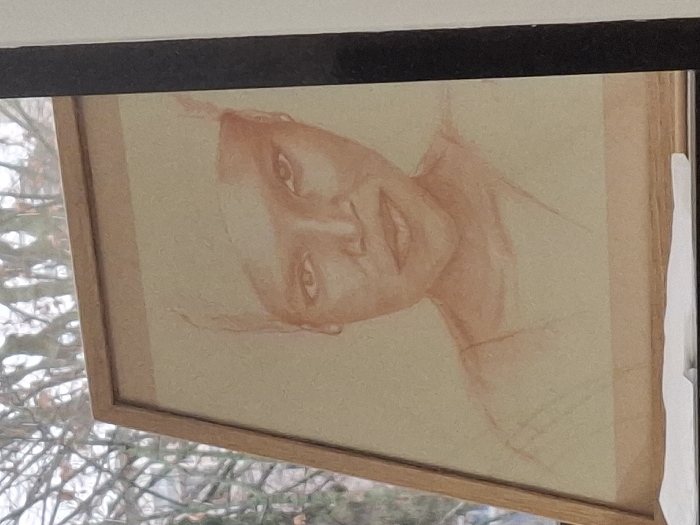 An interior shot shows a framed portrait drawing resting upright on a light-colored surface, positioned in front of a window