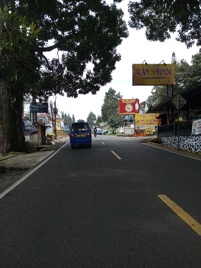 The image depicts an outdoor street scene under an overcast sky, viewed along a paved asphalt road marked with yellow dashed lines. A large tree with dark green foliage and ferns frames the left foreground, alongside a concrete sidewalk with utility poles and wires. A blue light-truck/van with a yellow license plate proceeds away from the viewer in the central lane. Further ahead, a motorcycle with a rider and another vehicle are also traveling in the same direction. On the left sidewalk, a blue sign reading "POS PELAYANAN" and "Polres Cirebon" is visible. The right side of the road features multiple commercial billboards: a prominent yellow sign displaying "ALAM SUNDA," a red sign for "BAKMI JAWA," and another "ALAM SUNDA" sign closer to the foreground. A building with a black and white patterned base and orange traffic cones are also present on the right. Despite the prompt specifying Chendenbji, Bhutan, the visible signage, including 'Alam Sunda,' 'Bakmi Jawa,' and 'Polres Cirebon,' indicates the scene is located in Indonesia.