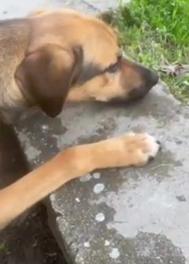 brown and tan dog lying on a concrete ledge, with its head resting on the edge. The dog has a chain around its neck. The area around the ledge is green with grass and some dirt. The camera focuses closely on the dog, moving slightly to show its head and paw resting on the concrete.