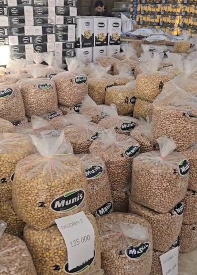large warehouse filled with stacks of pistachios in clear plastic bags, all labeled with the brand name "Munis