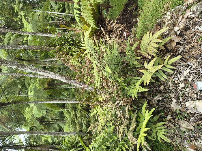 Lush, green ferns cover the scene. Taller tree ferns with broad, segmented fronds dominate, lining the background and left side. Closer, smaller ferns with more pointed leaves grow alongside a patch of dead leaves and mossy earth. Tree trunks are visible between the dense foliage. The overall impression is of a vibrant, moist forest environment.