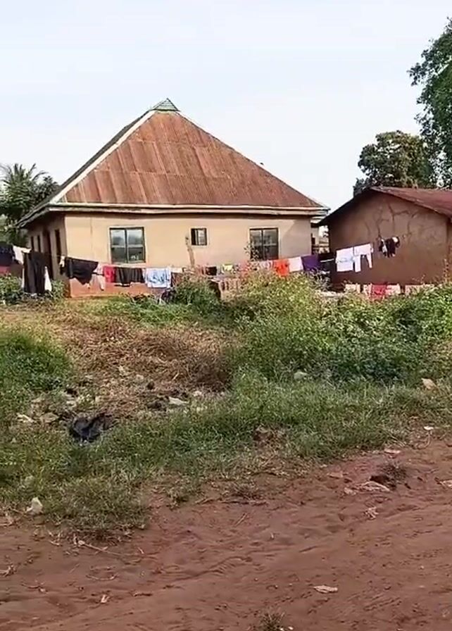 somewhat overgrown field with trash in front of three structures in the distance, under a cloudy sky. The foreground consists of a red dirt path, scattered with loose debris. Across the path, dense green vegetation partially obscures the view of the buildings. To the left is an unfinished brick structure, lacking windows and with protruding support pillars. Next to it is a small building with a light-colored roof and clothing drying on a line. Adjacent to this is another small structure with a rusty-red roof and more clothes hanging to dry. A large tree is behind this last building. There are no discernible people or actions taking place in the video.