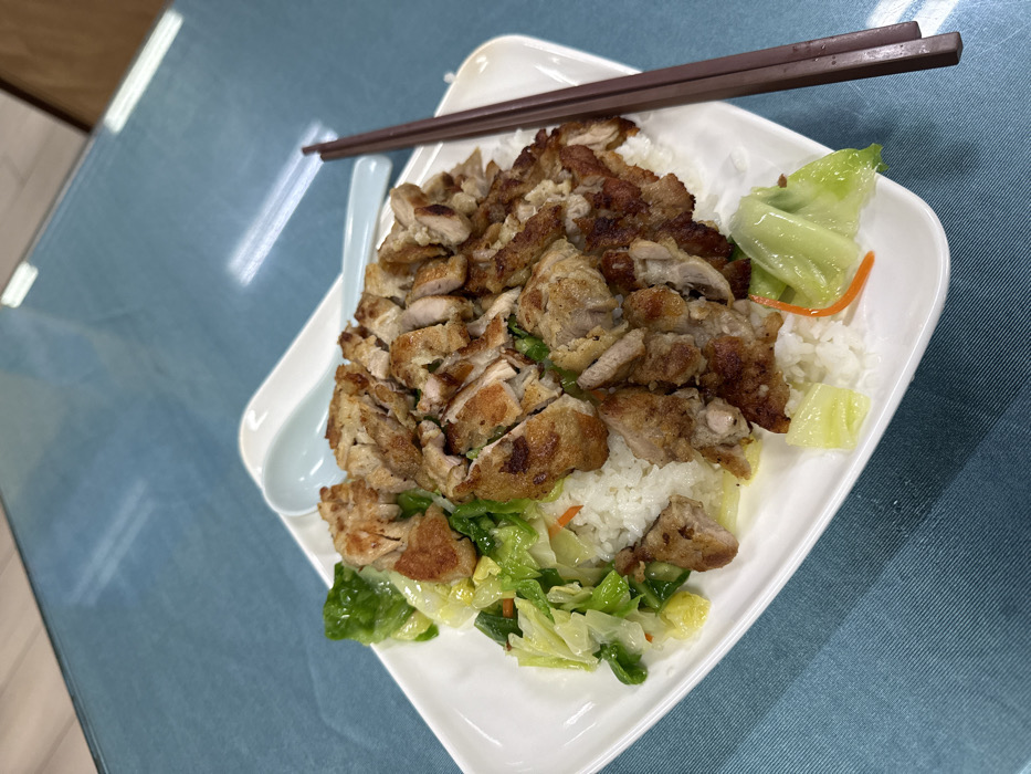 - "A rectangular white plate displays a meal consisting of white rice topped with segmented, pan-fried or roasted chicken pieces and steamed green leafy vegetables, including visible orange carrot strips" by FM-Mlchq1, licensed under CC BY 4.0