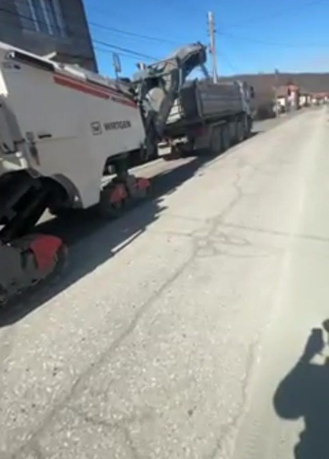 Wirtgen asphalt milling machine removing asphalt from a street. The machine is white and gray, with red accents, and has tracks for movement. It is positioned on a paved street in a residential area, with a building visible in the background. The milling machine is loading the asphalt it removes into a dark-colored dump truck driving in front of it. The sky is blue, and it appears to be a sunny day. A person holding the camera is partially visible on the right side of the video.